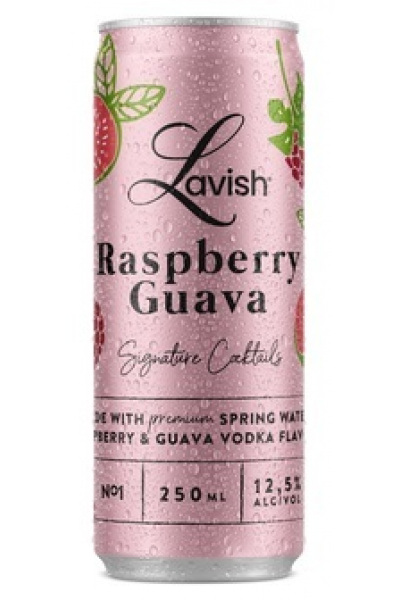 Lavish Raspberry Guava is een licht koolzuurhoudende cocktail met vodka smaak. Gemaakt met premium bronwater, en heeft een zoete en verfrissende framboos en guave vodka smaak. Lavish Raspberry Guava bevat 12,5% alcohol en is verpakt in een mat, kleurrijk blikje van 250 ml.